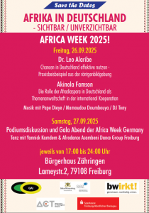 wir, German-Africa Insight (GAI) e.V. und das Africa Centre for Transregional Research (ACT) an der Universität Freiburg, laden Sie herzlich zu unserer Veranstaltungsreihe „Afrika in Deutschland – Sichtbar unverzichtbar“.